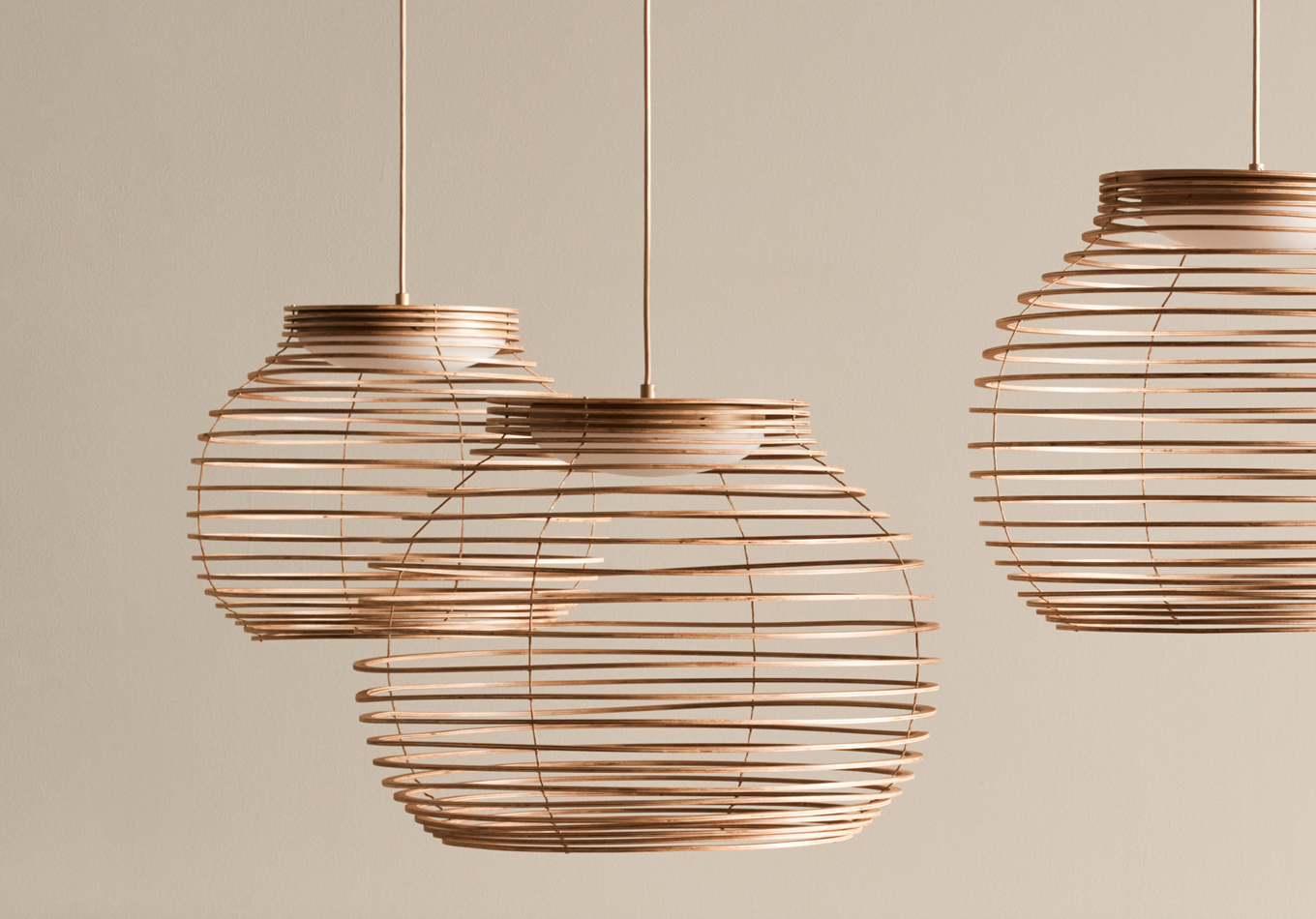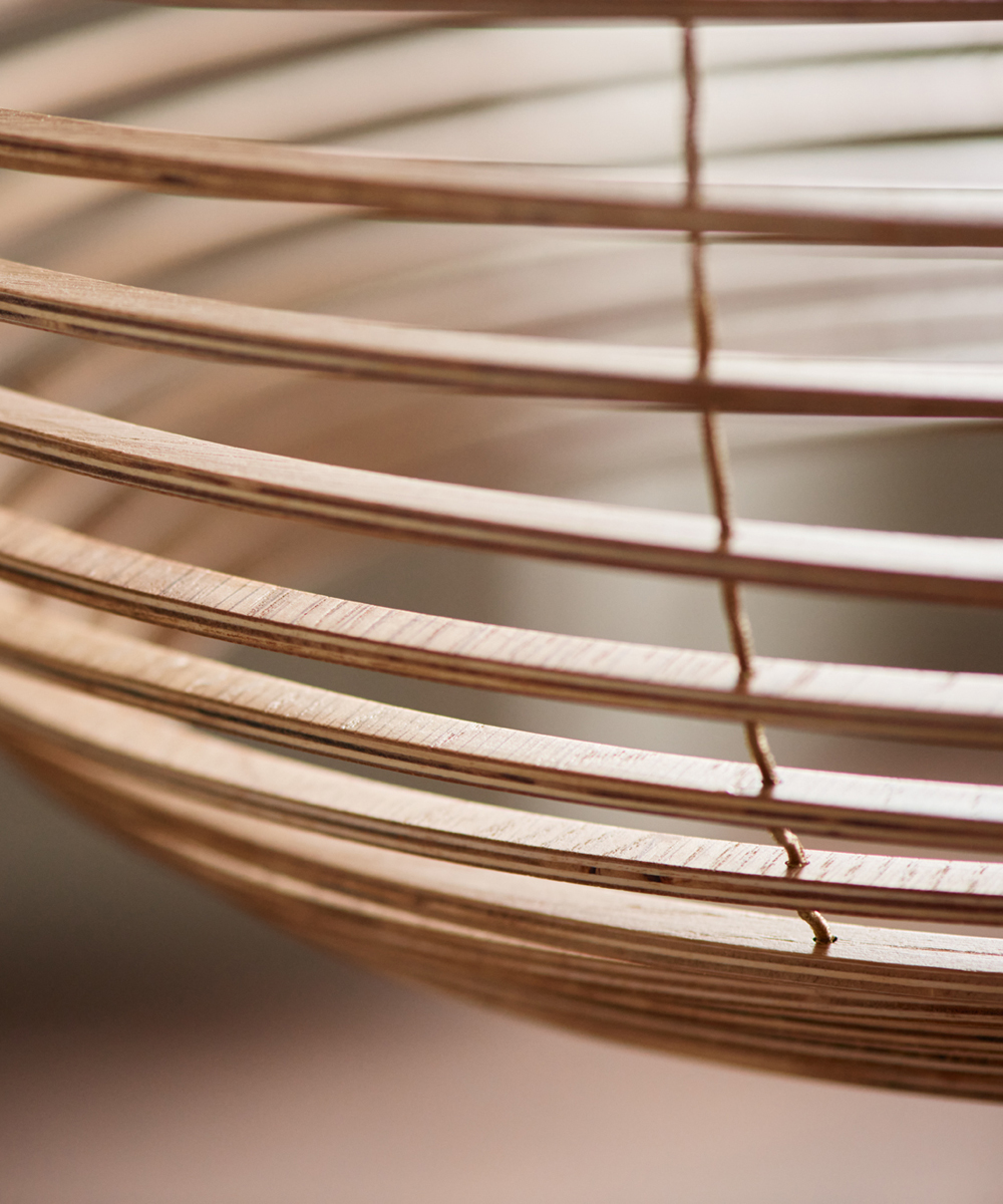 A series of voluminous yet airy pendants with a natural and effortless feel. Each pendant is composed of rings of oak or birch veneer, gently suspended by fine string that is knotted through each ring. The LED top emits a softly diffused light through the screen. Available in two sizes that can be grouped into atmospheric arrangements with a transparent quality. Anelli is a sustainable flat pack design.