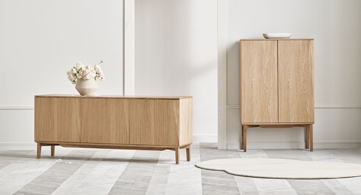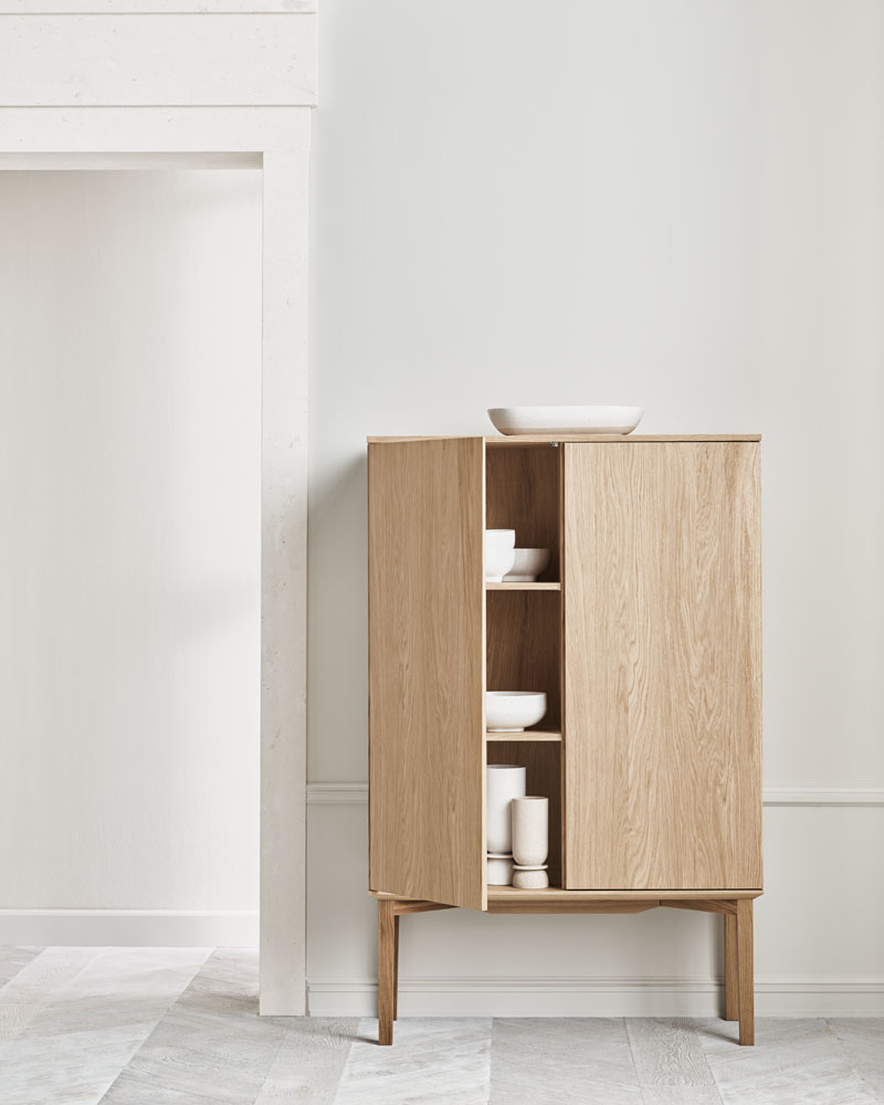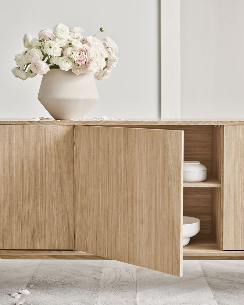 A minimalist range of sideboards, which are elevated from the ground by an elegant steel frame. Silent’s doors are linked by genuine wood craftsmanship, where the wood is diagonally cut to give the impression that Silent is made from two different types of wood. Instead, it features a discreet detail that gives the design its superior craftsmanship.